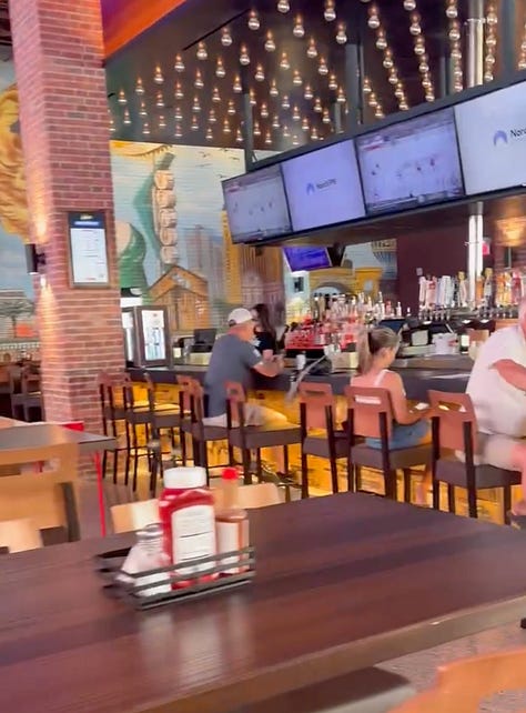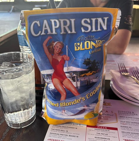 The Mrs. grabbed a “Capri Sin”—a tequila lemonade pouch served like an adult Capri Sun, and honestly, I’ll give them credit: that’s a fun idea. A little sweet for me, but she was happy. ( for $42 I would hope so)