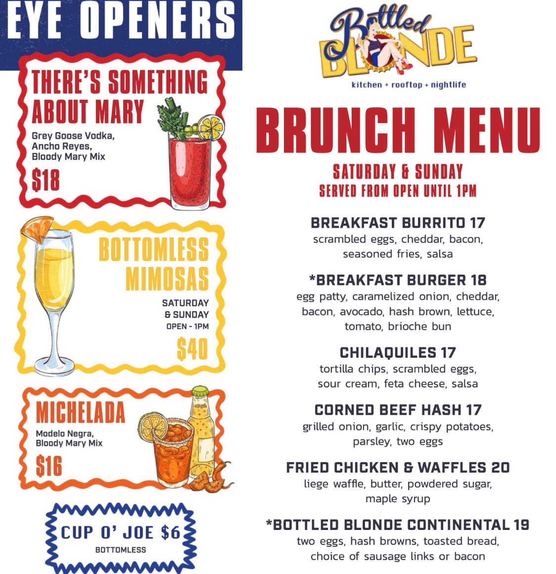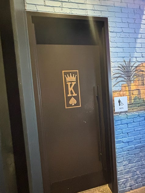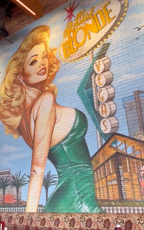 Décor-wise, Bottled Blonde keeps things casual but sharp, exposed brick, Vegas-flair murals, oversized TVs, and cheeky restroom signage (King & Queen cards).