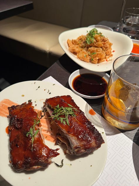Salt and Pepper Calamari arrived next- crispy chili, scallion, cilantro-lime dip. Texture on that has never been my jam, but wifey annihilated the entire plate and called it the best she’s ever had. ( I thought I was gonna have to get her a lobster bib 😂) Jasmine Tea Smoked Ribs were tender fall-off-the-bone, smoky with a hint of star anise. They were decent, not mind-blowing. We added Egg Fried Rice as a side to soak up the booze and slow the pace.