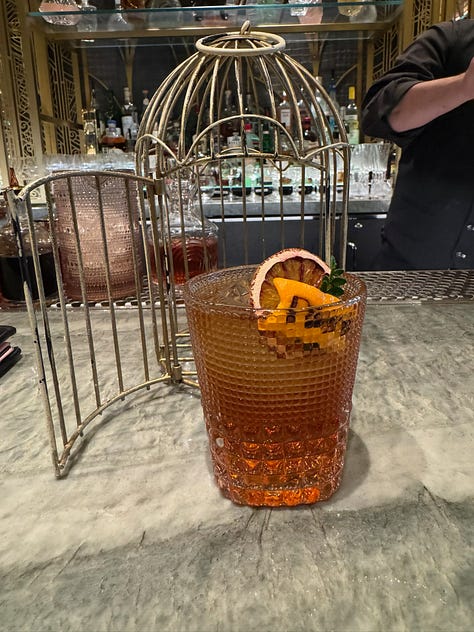 I ordered the Jailbird. Woodford Reserve with peach, served in a birdcage situation that I normally hate, but I’ll admit it: refreshing, balanced, and not trying to punch me in the mouth with sugar.
