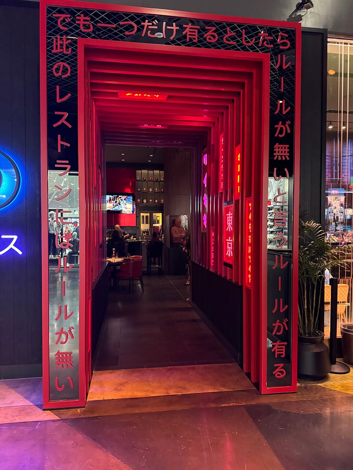 They went full neon Tokyo alleyway, all saturated color and buzzing signage, and it spills right into a gorgeous red-and-black bar that looks like a fancy underground whiskey den. This is where the night starts.