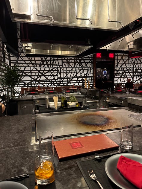 The bartender strolls up and asks if we want food menus. We tell her we’re eating at the teppanyaki table later.