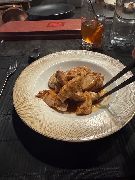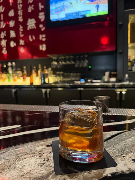 She makes us Morimoto Kōfu Old Fashioneds, which she calls the one actually good drink on the menu. I ended the night at five of them, four at the bar, one at dinner.