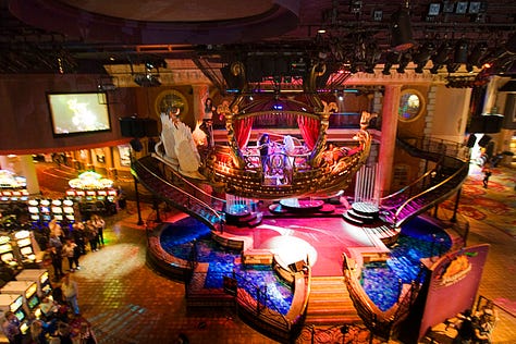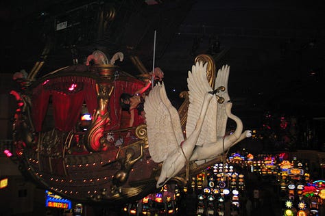 Rio was purchased by Harrah's / Caesars ($766 million) in 1999, and soon after, they had a free shuttle to Harrah’s for more Strip chaos. I remember gambling there while beads were thrown from hanging floats in the sky, stopping in for a drink at VooDoo Lounge, and then heading off to Palms for the later mayhem. For many, Rio was the spot. Tucked just enough away from the craziness with that shuttle giving strip access, you had a base you could call home and hang your hat before the night went sideways.