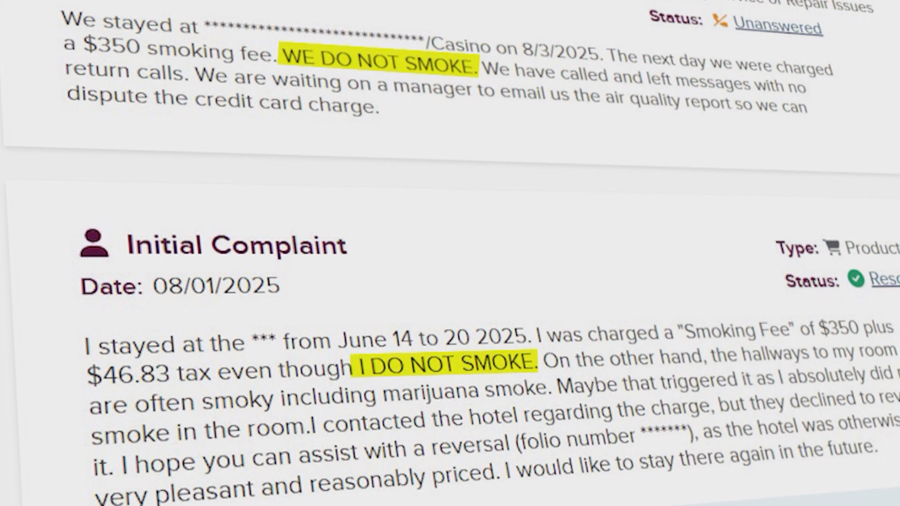A guest filed a complaint: “Stayed June 1 2025 … Our room reeked of cat urine & cigarette smoke. Check-in took nearly 40 minutes. We were charged $396.83 ($350 smoking fee) though we absolutely do not smoke.”