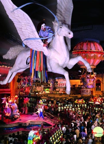 When Rio opened in January 1990, it was fresh: all-suite rooms, big energy, and a location just off the Strip that offered a distinct escape. In 1997, the real fun happened, and an expansion gave it The Masquerade Village and its signature “The Masquerade Show in the Sky”. Think floats overhead with people showering beads like it’s Mardi Gras every night.. Think suite-parties, Brazilian-theme, zip-line across the casino floor. If you were in your 20s during the early 2000s, Rio was your playground.