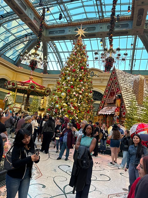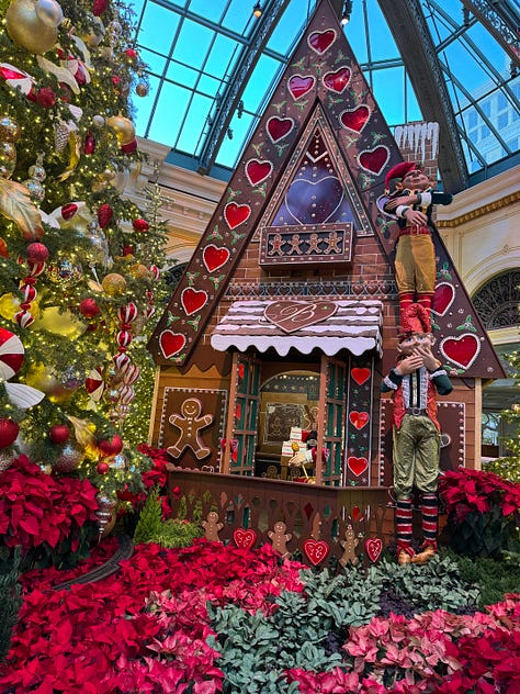 The Casinos go full Hallmark: giant ornament tunnels, LED trees taller than your self-esteem, themed lobbies, peppermint everything.