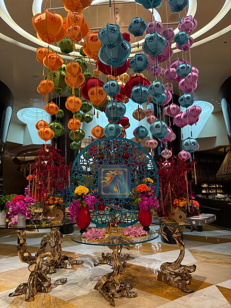 Something about the reds, deep, bold, everywhere, mixed with those tiny, obsessive details they nail harder than any other season. The lanterns glowing like they’re lit from within, the intricate florals, the way the whole thing feels alive and intentional. I don’t pretend to fully get every layer of the tradition, but I’ve pocketed more than a few red envelopes with $$$ tucked inside over the years, and I appreciate the inclusion every time.