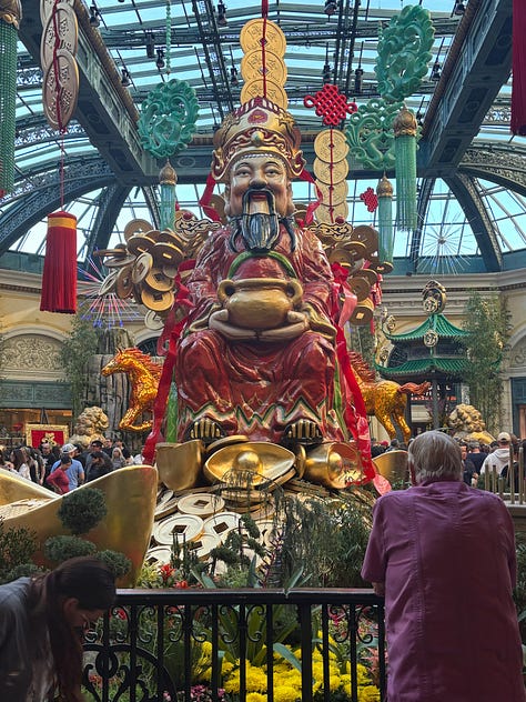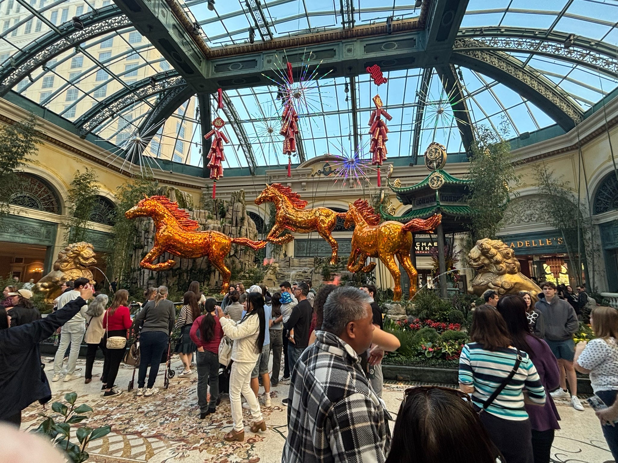 Bellagio Conservatory’s display (through Feb 28) is a stunner, three gold horses, Caishen the God of Wealth, Ajla the Cheerful Child, massive displays, and immersive florals. Free, always packed, but worth the walk-through.