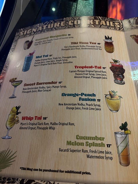 While we were there, we checked out the new tiki bar. The main area was closed, but we managed to grab a coconut margarita at the front bar. It was… fine. Nothing to complain about. Nothing to remember. If you’ve ever been to Golden Tiki, this won’t impress you. It also feels like an odd choice thematically. You’ve got a medieval castle and went with tiki? That feels like a missed opportunity for something far more on-theme.