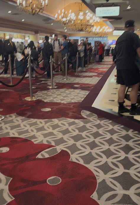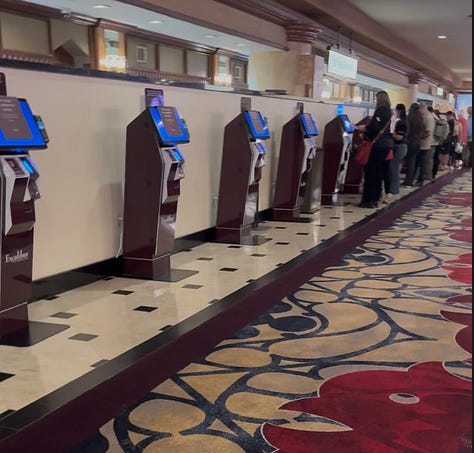 Despite that, there was still a line. Kiosks were operational. Staff was available. An employee was manning the kiosks, similar to that stupid self-checkout at the grocery store; people getting room keys from the app were not following instructions.