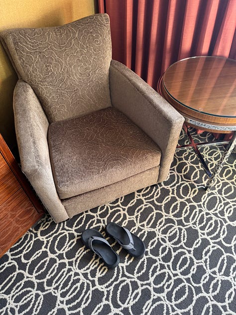 The AC? Ice cold. Those old-school under-window units still do their job. There was a tiny fridge. And housekeeping was thoughtful enough to leave behind the previous guest’s flip-flops.